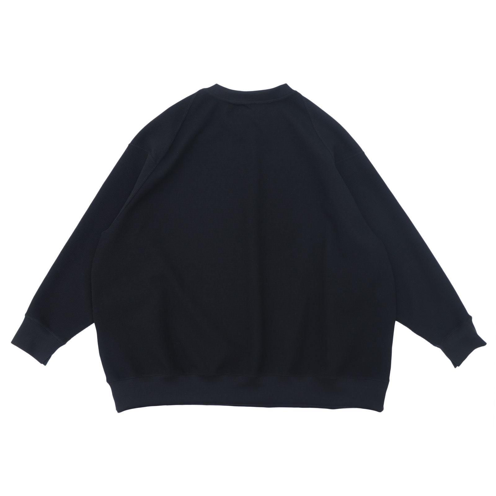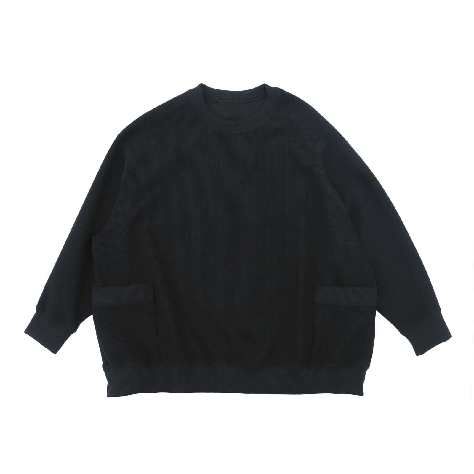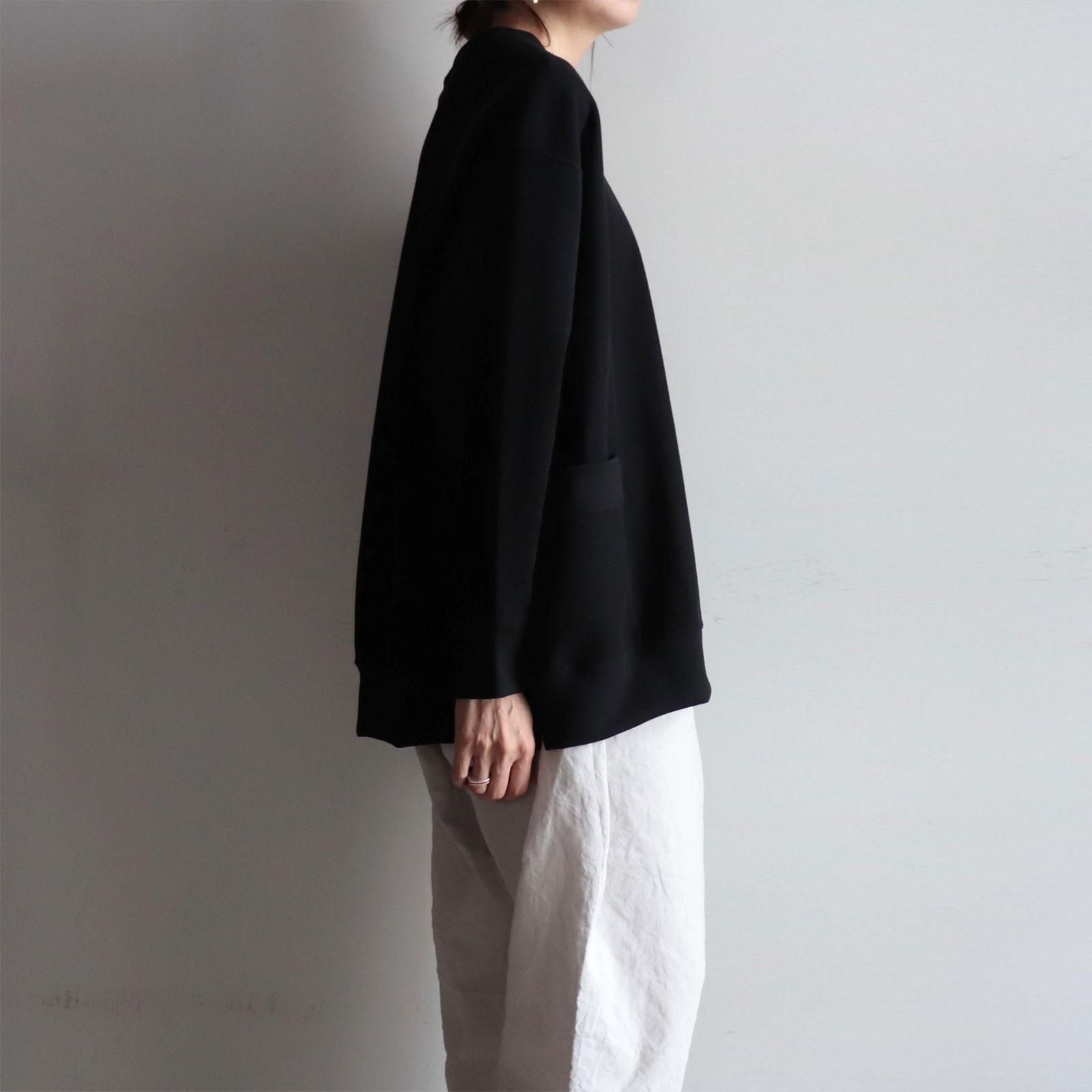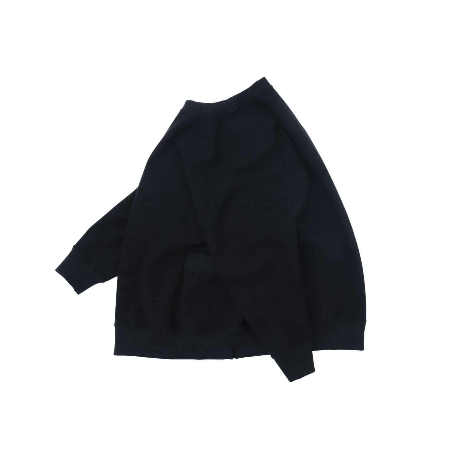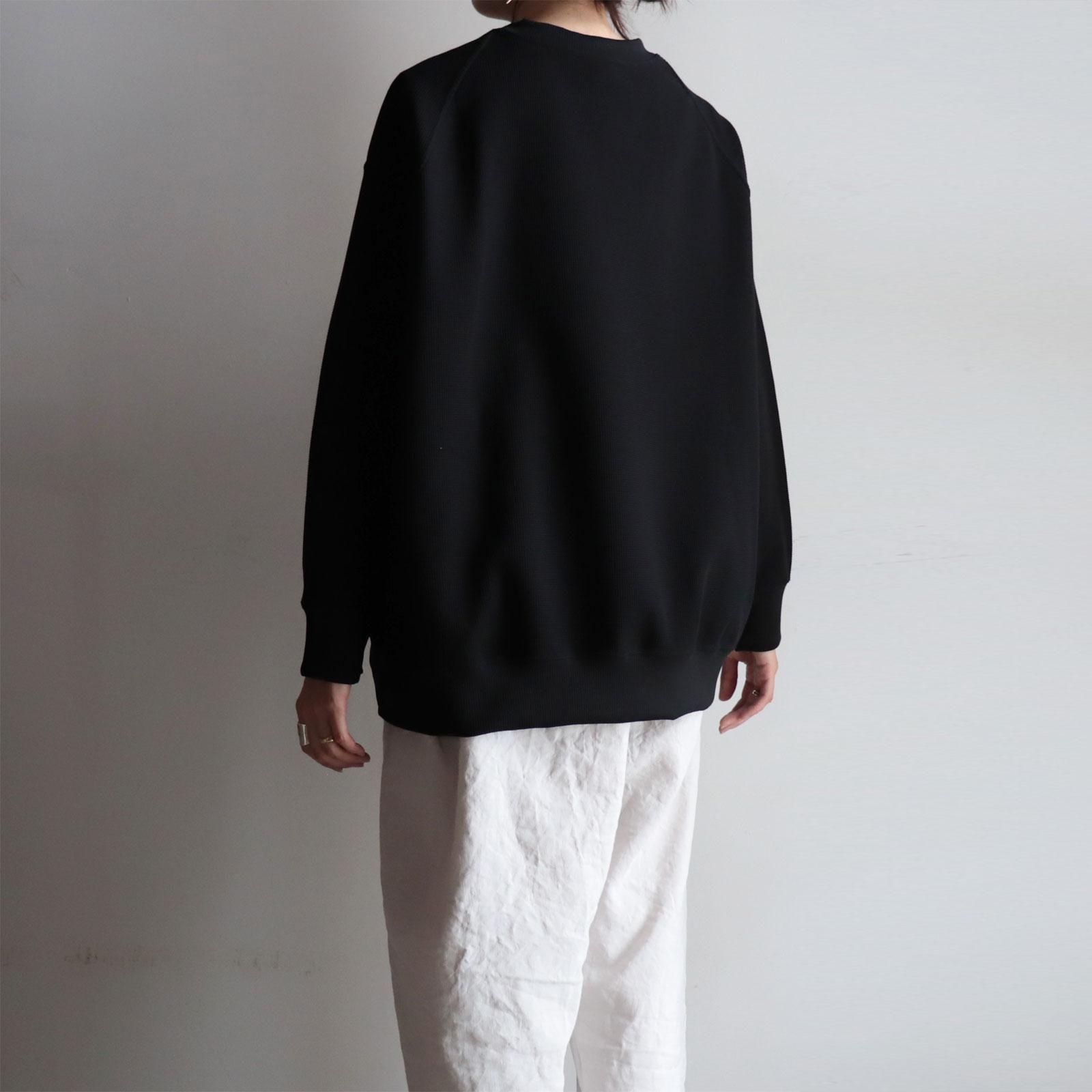 超撥水加工を施したストレッチポリエステル糸をジャカード機で複層ワッフルに編み立てた特別な生地で作られたクルーネック。ラグランスリーブの切り替え線をあえてずらすことで、前面から見るとセットインスリーブ、背面から見るとラグランスリーブに見えるような、表裏の表情を持たせたクルーネックです。空気を溜め込むも通気性にも優れ、汗をかいても速乾し肌にまとわりつかず、多少の水ならスルスルと弾いてくれます。1着300g程度の驚くほどの軽さと抜群のストレッチ性は、まるで何も身にまとっていないかのような解放感をもたらします。着心地よく、軽やかで、動きやすく、乾きやすく、それでいてさりげなくお洒落に映るお洋服は様々なシチュエーションが交差する日常に寄り添ってくれます。