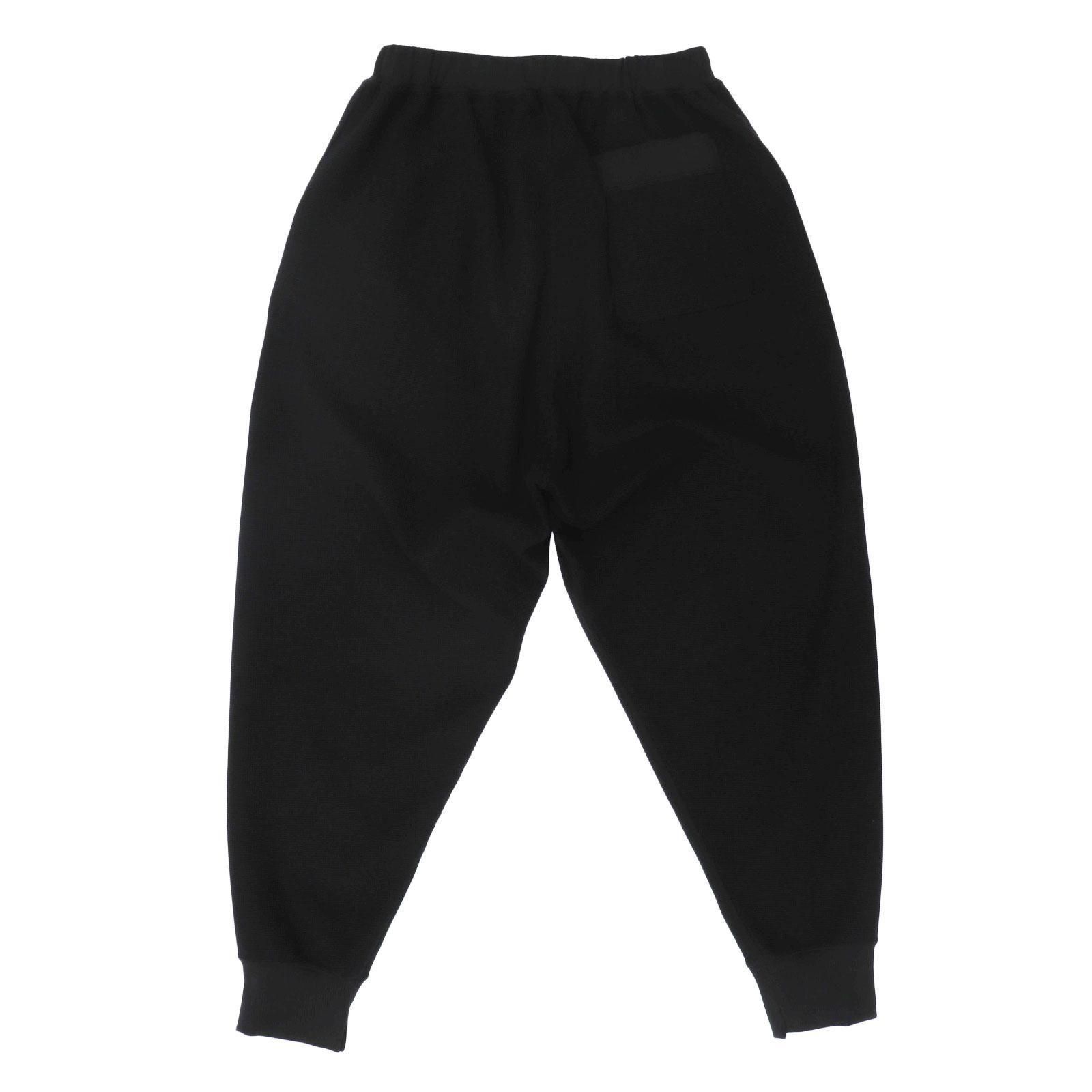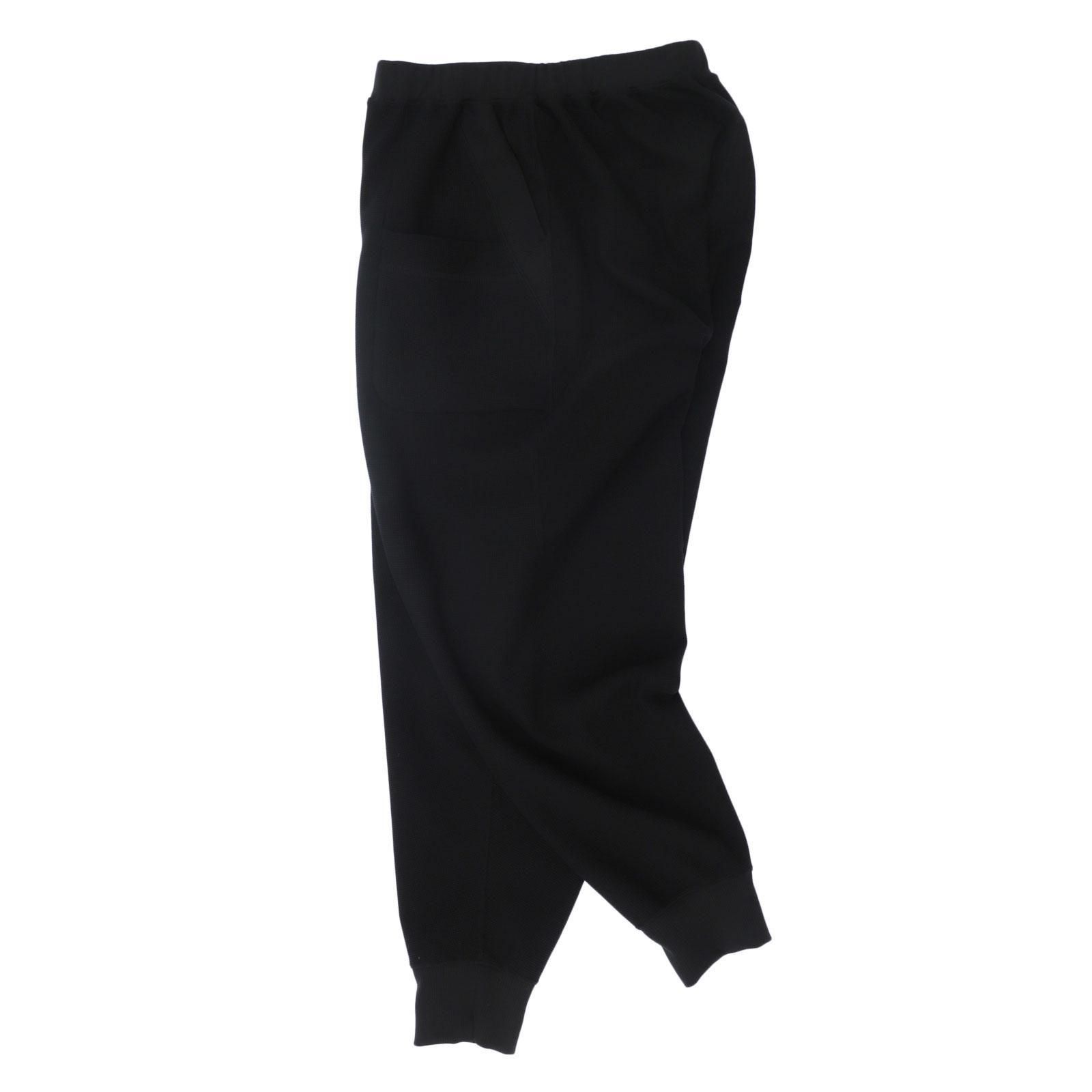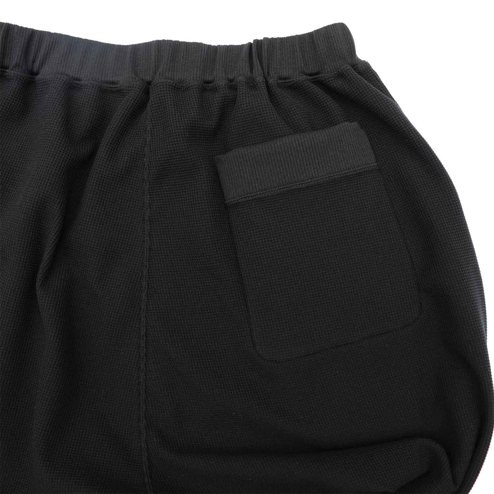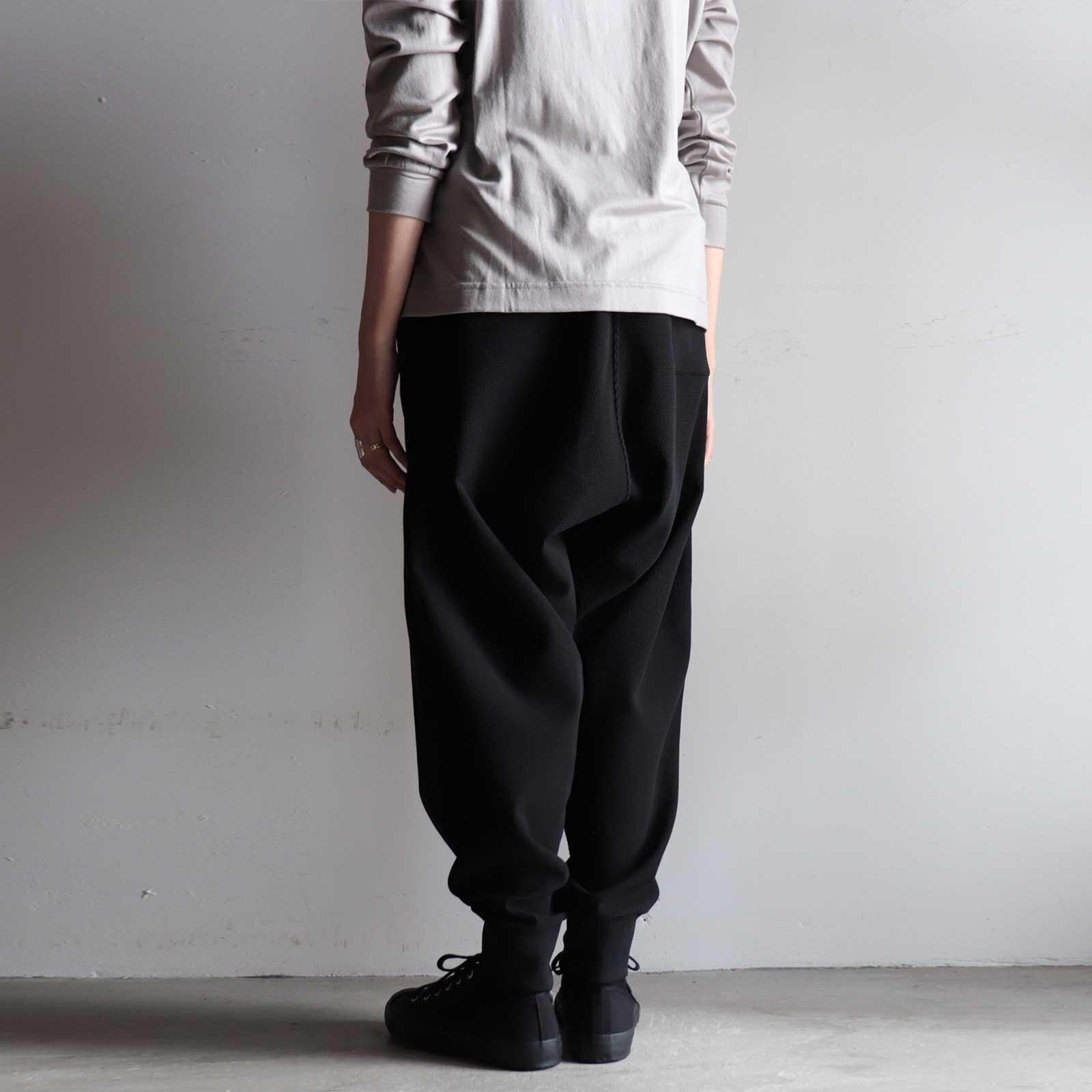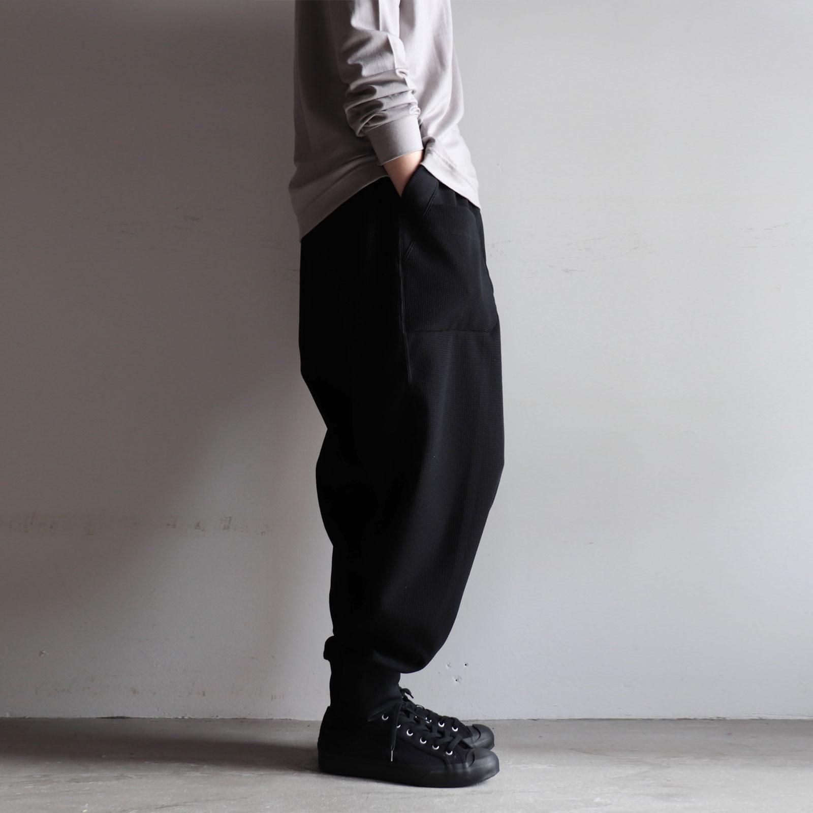 超撥水加工を施したストレッチポリエステル糸をジャカード機で複層ワッフルに編み立てた特別な生地で作られたパジャマパンツ。10年ほど前に作られていたパジャマパンツを今の生活に合わせてパターンを引き直したものです。腰回りはお洒落さを失わないようにラインを重視、膝から下のゆとりは足さばきが良い様に抑えぎみにして裾は引きずらないようにリブで始末されています。空気を溜め込むも通気性にも優れ、汗をかいても速乾し肌にまとわりつかず、多少の水ならスルスルと弾いてくれます。1着300g程度の驚くほどの軽さと抜群のストレッチ性は、まるで何も身にまとっていないかのような解放感をもたらします。着心地よく、軽やかで、動きやすく、乾きやすく、それでいてさりげなくお洒落に映るお洋服は様々なシチュエーションが交差する日常に寄り添ってくれます。